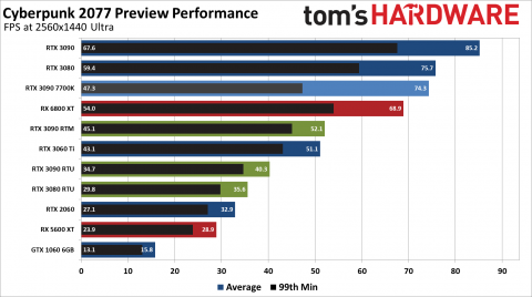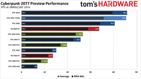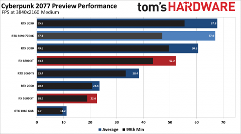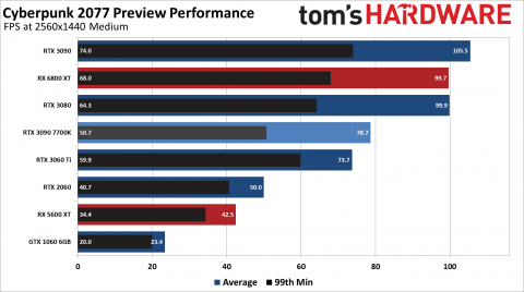На средних настройках графики без включённой трассировки лучей Cyberpunk 2077 в Full HD показывает всего лишь 30 кадров в секунду на народно любимой видеокарте NVIDIA GeForce GTX 1060 с памятью 6 ГБ. Владельцы AMD Radeon RX 5600 XT и NVIDIA GeForce RTX 2060 смогут получить почти эталонную производительность — 53 и 60 кадров в секунду соответственно. А вот в 2560x1440 даже на «средних» настройках изображения игру не «вывозит» даже RTX 2060 — для параметра 60 fps необходима новейшая RTX 3060 Ti. И это только начало.