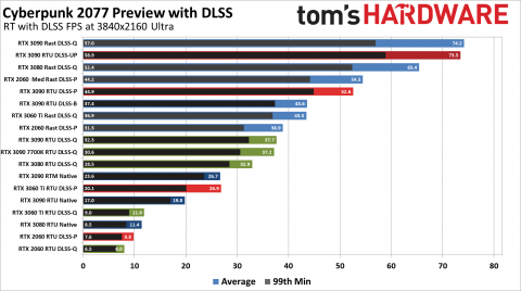 Видеокарты серии RTX покупались геймерами в первую очередь ради возможности прикоснуться к трассировке лучей, но... кажется, не в этот раз. Чтобы сыграть в Cyberpunk 2077 с включённым рейтрейсингом, придётся активировать режим DLSS с акцентом на производительность. В этом случае при 60 кадрах в секунду в Full HD смогут поиграть владельцы RTX 3080 и RTX 3090. Младшая RTX 3060 Ti показывает 47 кадров в секунду, а бюджетная RTX 2060 — всего лишь 24 кадра. Результаты в более высоких разрешениях — в галерее выше.
